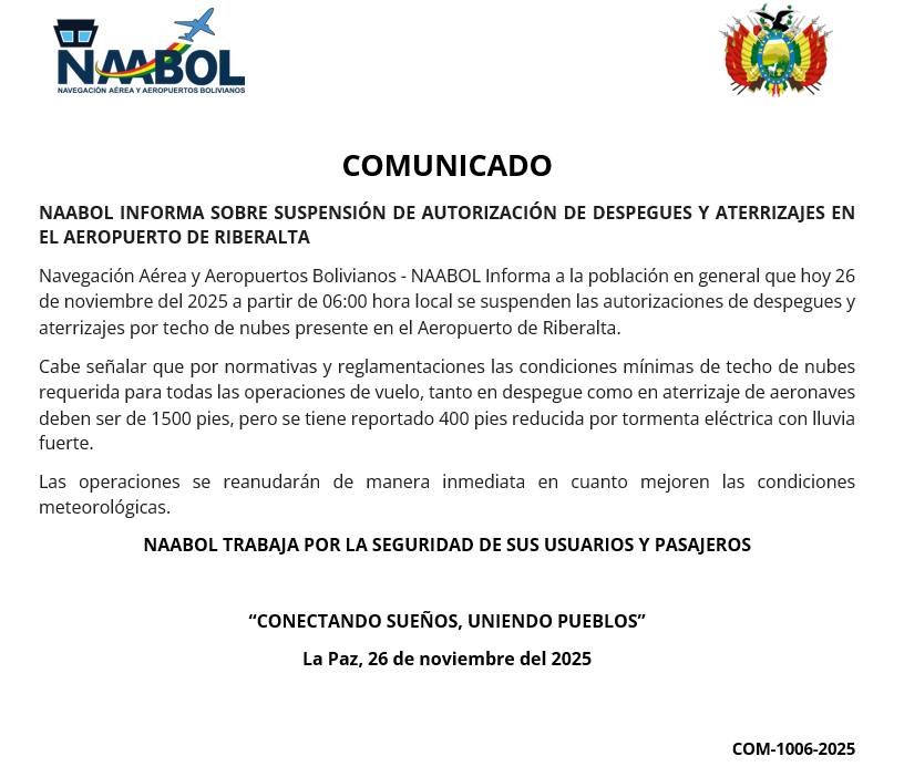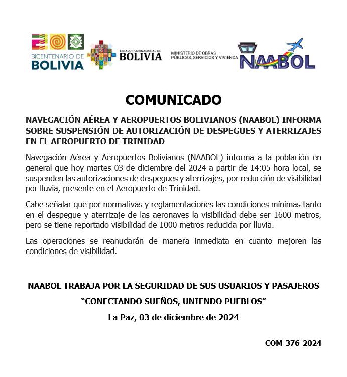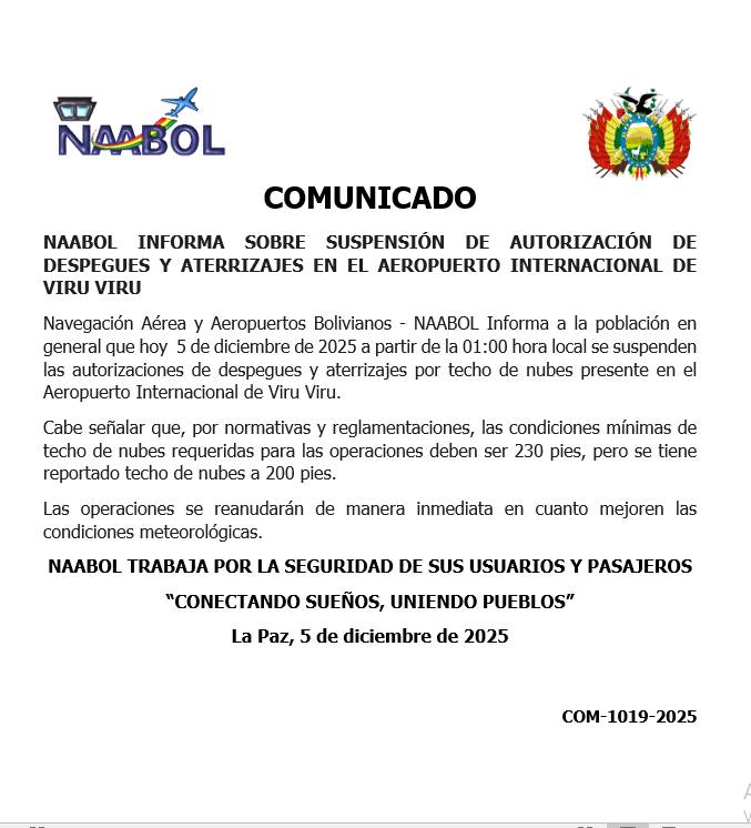 NAABOL informa avances del 85% en la implementación de nuevos puentes de abordaje en tres aeropuertos internacionales del país Navegación Aérea y Aeropuertos Bolivianos (NAABOL) informa a la opinión pública y a la